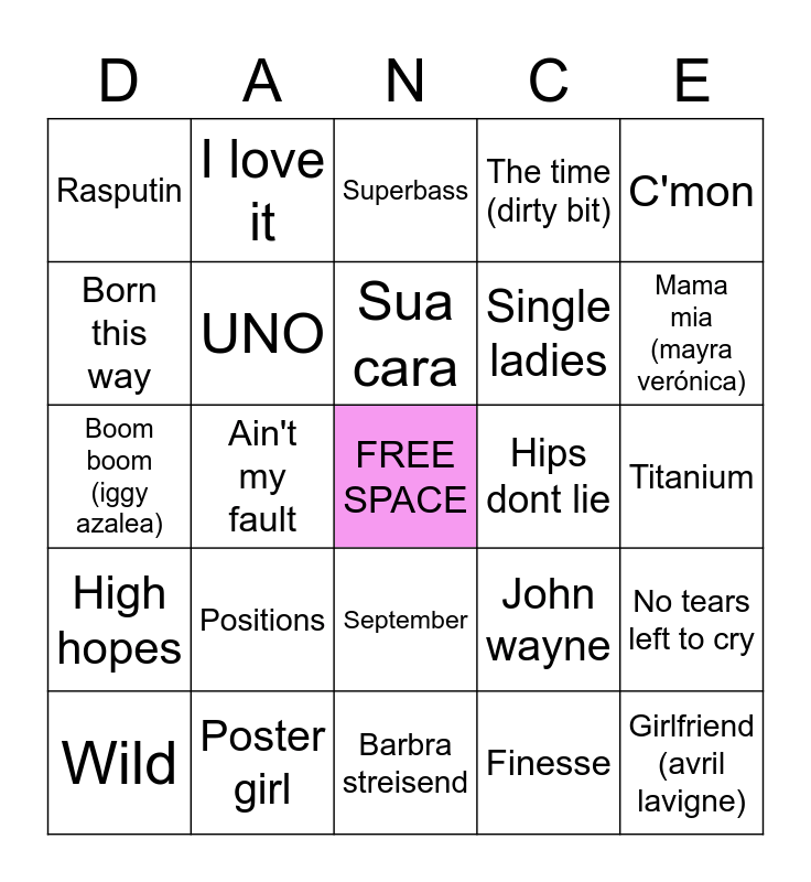 This bingo card has a free space and 24 words: Positions, Poster girl, Sua cara, Wild, C'mon, Rasputin, Born this way, I love it, Hips dont lie, September, Single ladies, Boom boom (iggy azalea), John wayne, No tears left to cry, UNO, Finesse, Titanium, Superbass, Mama mia (mayra verónica), Ain't my fault, Girlfriend (avril lavigne), High hopes, The time (dirty bit) and Barbra streisend.