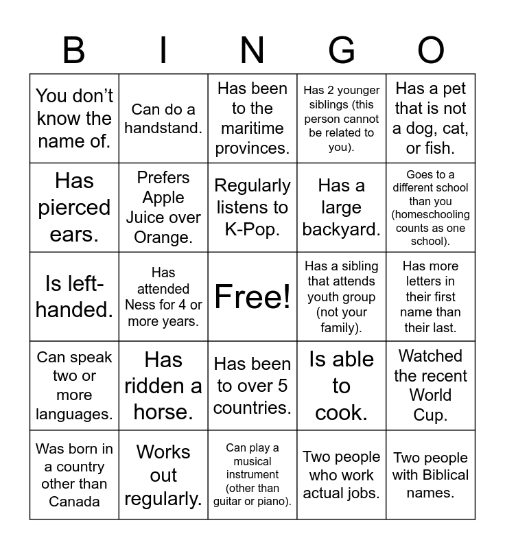 This bingo card has a free space and 37 words: Has read the Bible all of the way through., Has read the Old Testament entirely in the last year., Prefers Math over English., Prefers Apple Juice over Orange., Watched the recent World Cup., Has ridden a horse., Regularly listens to K-Pop., Has a Driver’s License., Has a pet that is not a dog, cat, or fish., Plays football or soccer., Has attended Ness for 4 or more years., Has 2 younger siblings (this person cannot be related to you)., Two people with Biblical names., Has more letters in their first name than their last., Has pierced ears., Can speak two or more languages., Has swam in two or more oceans., Has been to the maritime provinces., Has been to over 5 countries., Has a sibling that attends youth group (not your family)., You don’t know the name of., Goes to a different school than you (homeschooling counts as one school)., Was born in a country other than Canada, Can play a musical instrument (other than guitar or piano)., Three people born in the same month as a team-member., Two people who work actual jobs., Can do a handstand., Has run in a race., Helps at food bank., Has summited a mountain., Has missed 10 or more days of school since September, Works out regularly., Is left-handed., Has a childhood nickname., Is able to cook., Has a large backyard. and Has a favourite pen.