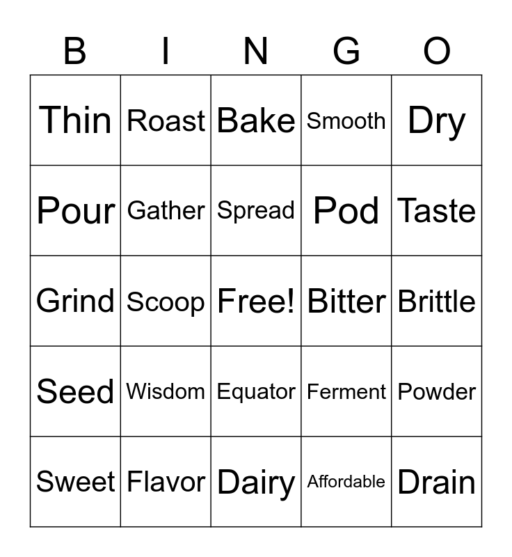 This bingo card has a free space and 24 words: Wisdom, Flavor, Spread, Sweet, Dry, Thin, Pour, Roast, Bitter, Equator, Pod, Grind, Ferment, Powder, Gather, Affordable, Brittle, Bake, Taste, Scoop, Drain, Seed, Smooth and Dairy.