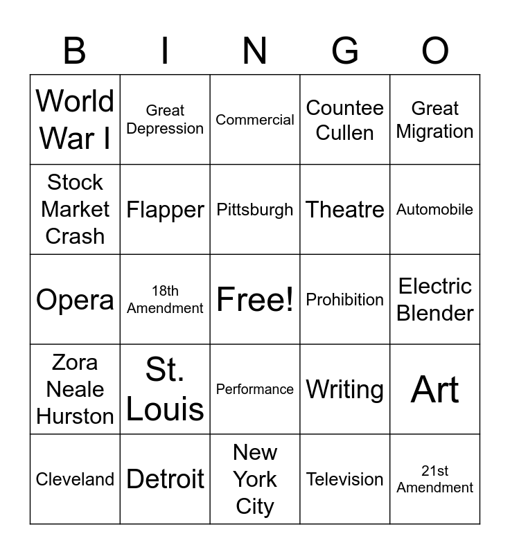 This bingo card has a free space and 24 words: St. Louis, Detroit, Pittsburgh, Cleveland, Great Migration, World War I, Stock Market Crash, Great Depression, Prohibition, Performance, Theatre, Opera, Writing, Art, Flapper, Television, Electric Blender, Commercial, Automobile, 18th Amendment, 21st Amendment, Zora Neale Hurston, Countee Cullen and New York City.