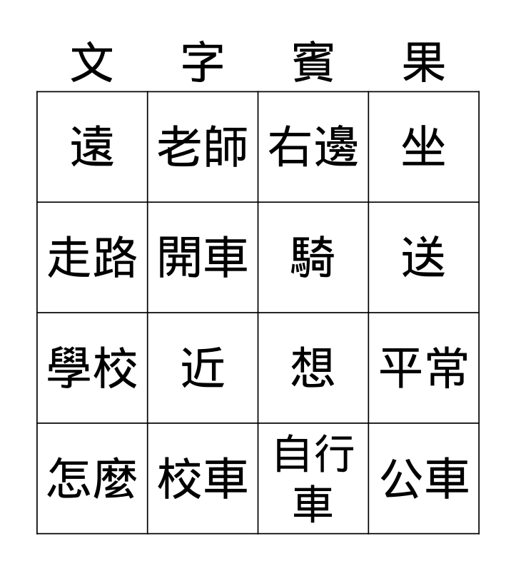 This bingo card has 16 words: 怎麼, 校車, 右邊, 坐, 走路, 老師, 想, 平常, 遠, 開車, 自行車, 送, 學校, 近, 騎 and 公車.
