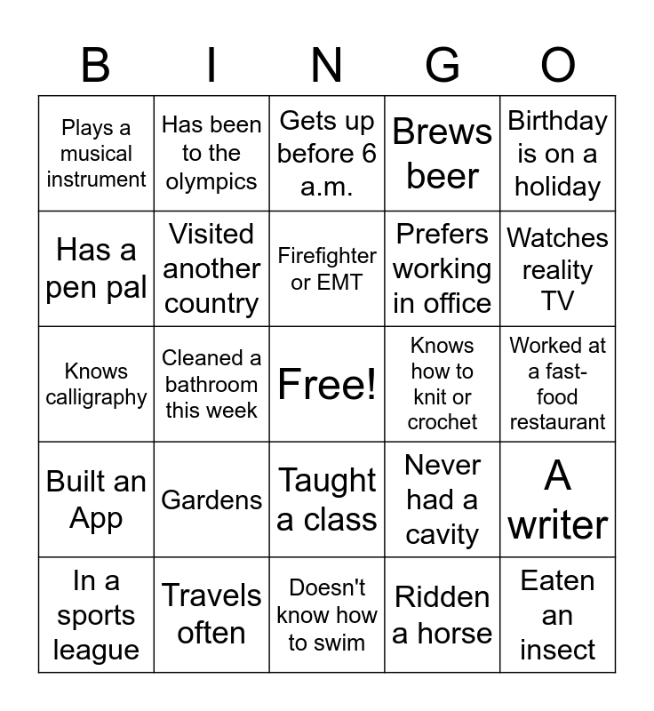 This bingo card has a free space and 31 words: Doesn't know how to swim, Been to Hawaii, Cleaned a bathroom this week, Changed a diaper, Plays a musical instrument, Gets up before 6 a.m., Visited another country, Never had a cavity, Knows how to knit or crochet, Ridden a horse, Worked at a fast-food restaurant, Eaten an insect, Never broken a bone, Skipped breakfast today, Watches reality TV, Likes anchovies pizza, A writer, Gardens, Built an App, Taught a class, Birthday is on a holiday, Knows how to read tarot, In a sports league, Has been to the olympics, Prefers working in office, Has a pen pal, Brews beer, Knows calligraphy, Travels often, Firefighter or EMT and Ran in a marathon.