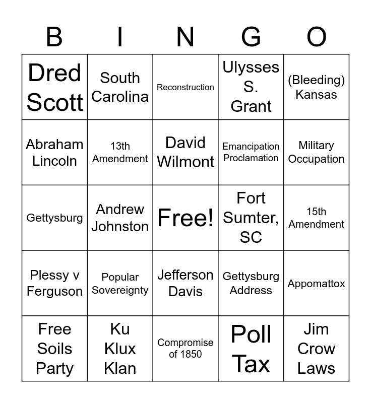 This bingo card has a free space and 25 words: Popular Sovereignty, Compromise of 1850, David Wilmont, Free Soils Party, (Bleeding) Kansas, Dred Scott, Abraham Lincoln, South Carolina, Fort Sumter, SC, Jefferson Davis, Emancipation Proclamation, Gettysburg, Gettysburg Address, Appomattox, 13th Amendment, 14th Amendment, 15th Amendment, Reconstruction, Military Occupation, Andrew Johnston, Jim Crow Laws, Ku Klux Klan, Plessy v Ferguson, Ulysses S. Grant and Poll Tax.