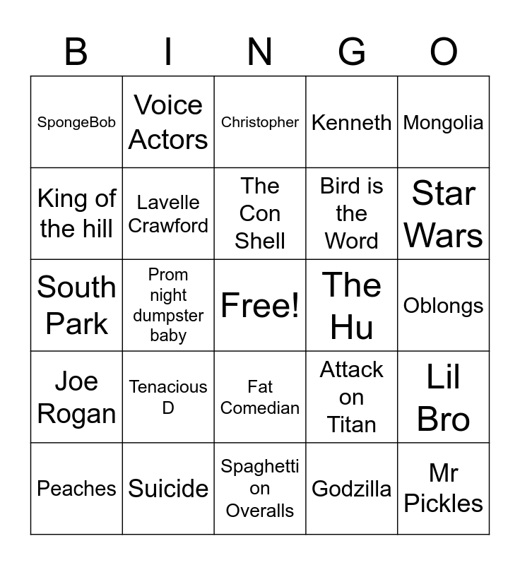 This bingo card has a free space and 31 words: Gabriel Iglesias, Suicide, The Con Shell, Blue mouse, Mongolia, SpongeBob, Prom night dumpster baby, Spaghetti on Overalls, Bird is the Word, Mr Pickles, Peaches, Tenacious D, Godzilla, Dimensions, Joe Rogan, Kangaroo Jack, Fat Comedian, The Hu, Oblongs, Gnome, Voice Actors, Power Rangers, Attack on Titan, Star Wars, South Park, Lavelle Crawford, Christopher, Kenneth, Lil Bro, King of the hill and Madagascar.