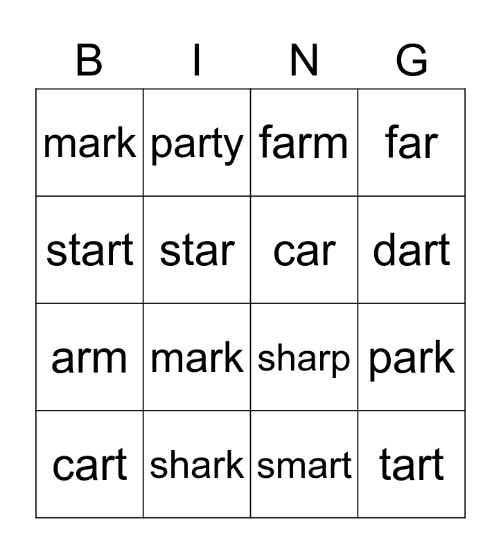 This bingo card has 16 words: shark, park, farm, mark, arm, party, sharp, smart, start, star, cart, far, mark, dart, car and tart.