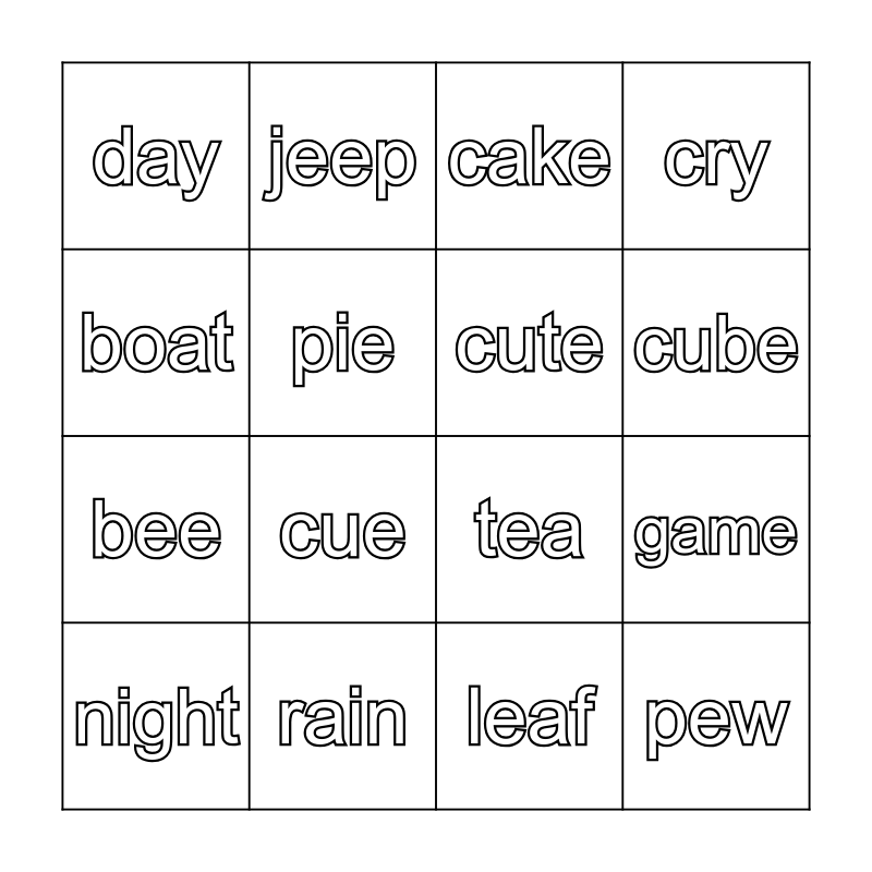 This bingo card has 16 words: rain, game, cake, day, bee, jeep, tea, leaf, boat, pie, night, cry, cue, cube, cute and pew.