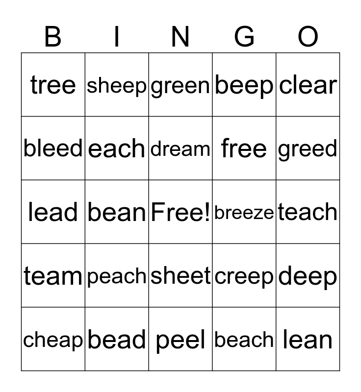 This bingo card has a free space and 24 words: peach, bead, dream, cheap, clear, tree, bleed, sheep, breeze, sheet, free, lead, creep, deep, each, beach, teach, green, greed, bean, lean, team, beep and peel.