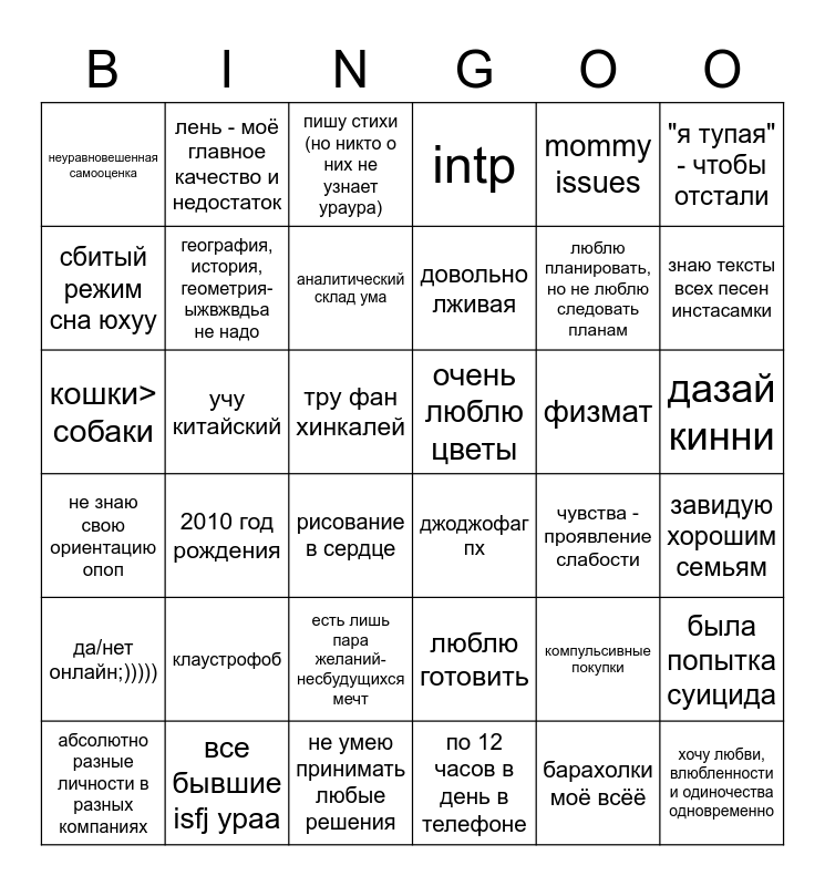 This bingo card has 36 words: люблю готовить, есть лишь пара желаний- несбудущихся мечт, по 12 часов в день в телефоне, сбитый режим сна юхуу, не знаю свою ориентацию опоп, очень люблю цветы, география, история, геометрия- ыжвжвдьа не надо, не умею принимать любые решения, mommy issues, компульсивные покупки, знаю тексты всех песен инстасамки, intp, была попытка суицида, учу китайский, довольно лживая, неуравновешенная самооценка, да/нет онлайн;))))), физмат, кошки> собаки, пишу стихи (но никто о них не узнает ураура), тру фан хинкалей, 2010 год рождения, джоджофаг пх, рисование в сердце, чувства - проявление слабости, лень - моё главное качество и недостаток, люблю планировать, но не люблю следовать планам, все бывшие isfj ураа, аналитический склад ума, "я тупая" - чтобы отстали, хочу любви, влюбленности и одиночества одновременно, абсолютно разные личности в разных компаниях, завидую хорошим семьям, дазай кинни, клаустрофоб and барахолки моё всёё.