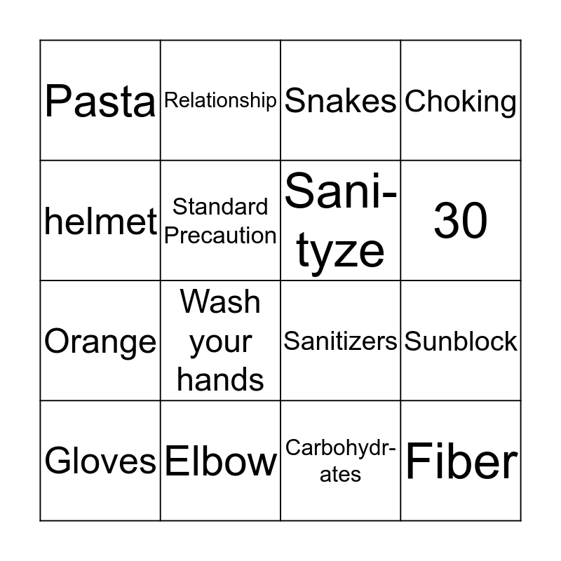 This bingo card has 16 words: Elbow, Sunblock, Snakes, Pasta, Orange, Relationship, Sanitizers, Carbohydr-ates, helmet, Standard Precaution, Gloves, Choking, Wash your hands, 30, Sani-tyze and Fiber.