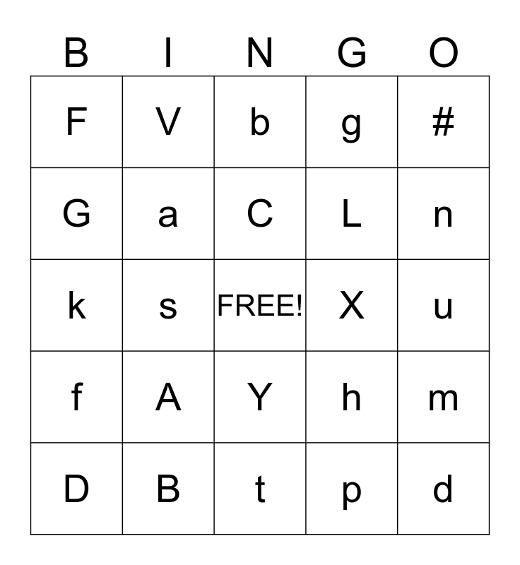 This bingo card has a free space and 24 words: A, B, C, D, #, F, G, V, X, Y, L, k, h, m, a, p, u, b, n, s, d, f, g and t.