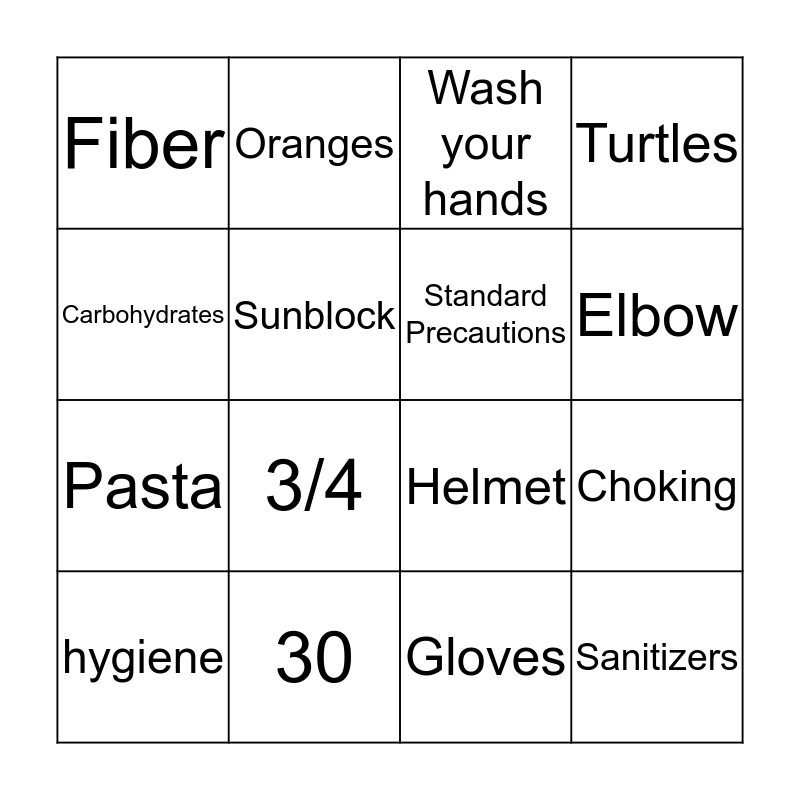 This bingo card has 16 words: 30, Choking, Wash your hands, Fiber, Pasta, Oranges, Helmet, Gloves, Carbohydrates, Sunblock, hygiene, Turtles, 3/4, Elbow, Standard Precautions and Sanitizers.
