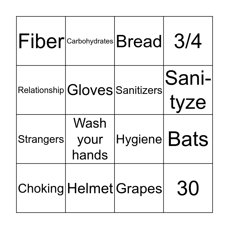 This bingo card has 16 words: Helmet, Bats, Bread, Fiber, Strangers, Carbohydrates, Hygiene, Grapes, Relationship, Gloves, Choking, 3/4, Wash your hands, Sani-tyze, Sanitizers and 30.