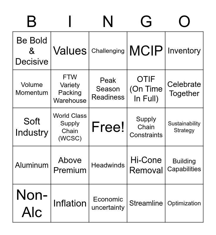 This bingo card has a free space and 44 words: Revitalization, Optimization, Simply Spiked, Non-Alc, Diversification, Streamline, Challenging, Momentum, Inventory, Inflation, MCIP, Supply Chain Constraints, Headwinds, Above Premium, Global inflationary pressures, Economic uncertainty, Net sales revenue (NSR), Soft Industry, Strategy, Celebrate Together, Values, Take Accountability, One North America, Be Bold & Decisive, Learn Every Day, Sustainability Strategy, Bottle Shortages, Closure Shortages, Hi-Cone Removal, Aluminum, Can Strategy, Building Capabilities, Employee Survey, Volunteer Hours, World Class Supply Chain (WCSC), Supply Chain Capabilities, EHS, Supply Chain Leadership, Peak Season Readiness, Volume Momentum, OTIF (On Time In Full), G150, FTW Variety Packing Warehouse and Our Imprint Strategy.
