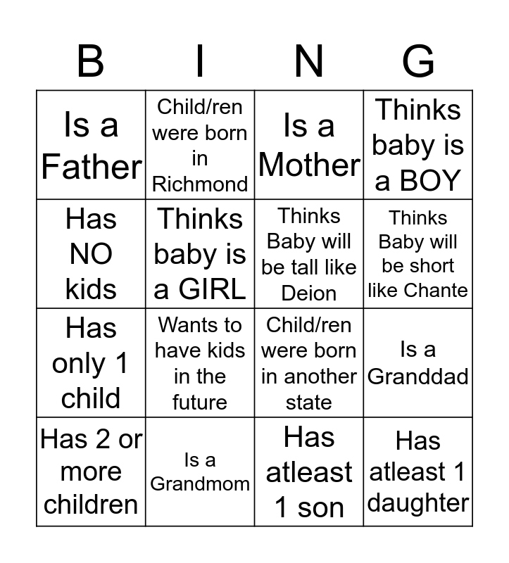 This bingo card has 16 words: Is a Grandmom, Is a Granddad, Is a Mother, Is a Father, Has only 1 child, Child/ren were born in Richmond, Child/ren were born in another state, Has atleast 1 son, Has NO kids, Thinks baby is a GIRL, Has 2 or more children, Thinks baby is a BOY, Wants to have kids in the future, Thinks Baby will be short like Chante, Thinks Baby will be tall like Deion and Has atleast 1 daughter.