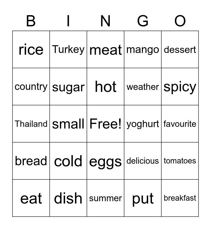 This bingo card has a free space and 27 words: delicious, vegetables, weather, summer, country, meat, Turkey, bread, yoghurt, tomatoes, Thailand, mango, eat, dish, spicy, milk, sugar, hot, cold, rice, favourite, put, small, breakfast, eggs, dessert and food.