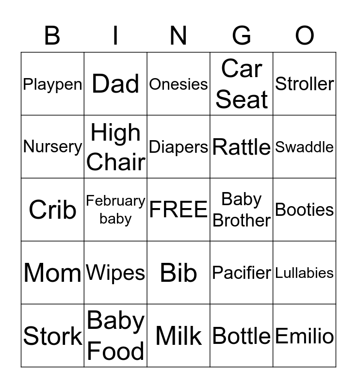 This bingo card has a free space and 24 words: Wipes, Baby Food, Diapers, Stork, Stroller, Playpen, Nursery, Dad, Baby Brother, Bib, Rattle, Crib, Pacifier, Lullabies, High Chair, Bottle, Booties, Onesies, Swaddle, February baby, Emilio, Mom, Car Seat and Milk.