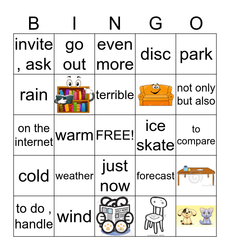This bingo card has 6 images, a free space and 18 words: weather, wind, terrible, to do , handle, park, invite , ask, rain, go out, ice skate, just now, on the internet, forecast, to compare, even more, not only but also, warm, cold and disc.