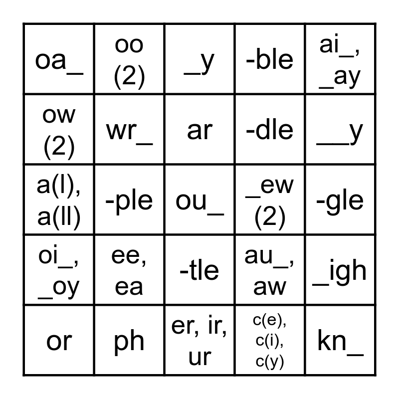 This bingo card has 25 words: ee, ea, er, ir, ur, ar, or, ai_, _ay, oa_, ow (2), oo (2), _ew (2), -tle, -dle, a(l), a(ll), au_, aw, _igh, wr_, kn_, -gle, _y, __y, -ple, ou_, ph, oi_, _oy, -ble and c(e), c(i), c(y).
