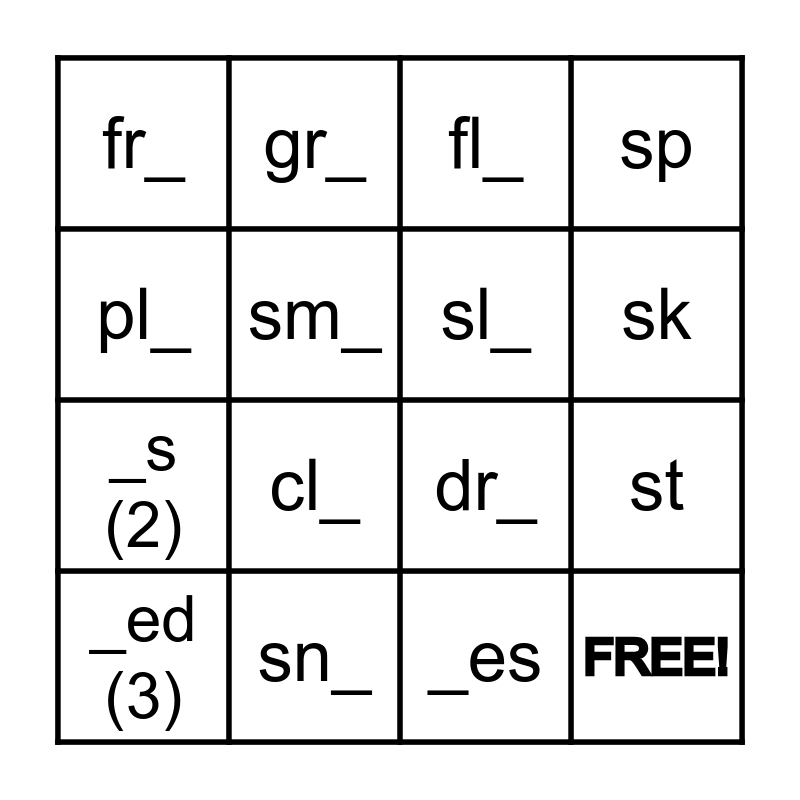 This bingo card has 16 words: sn_, st, fl_, fr_, _s (2), gr_, dr_, _es, pl_, sm_, _ed (3), sp, cl_, sk, sl_ and FREE!.