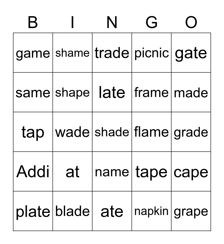 This bingo card has 25 words: at, ate, late, plate, gate, game, same, shame, flame, name, frame, tap, tape, cape, shape, grape, grade, trade, made, wade, shade, blade, Addi, picnic and napkin.