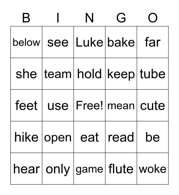 This bingo card has a free space and 24 words: open, only, hold, hear, far, below, she, see, mean, eat, keep, feet, read, be, team, flute, cute, Luke, tube, use, woke, hike, bake and game.
