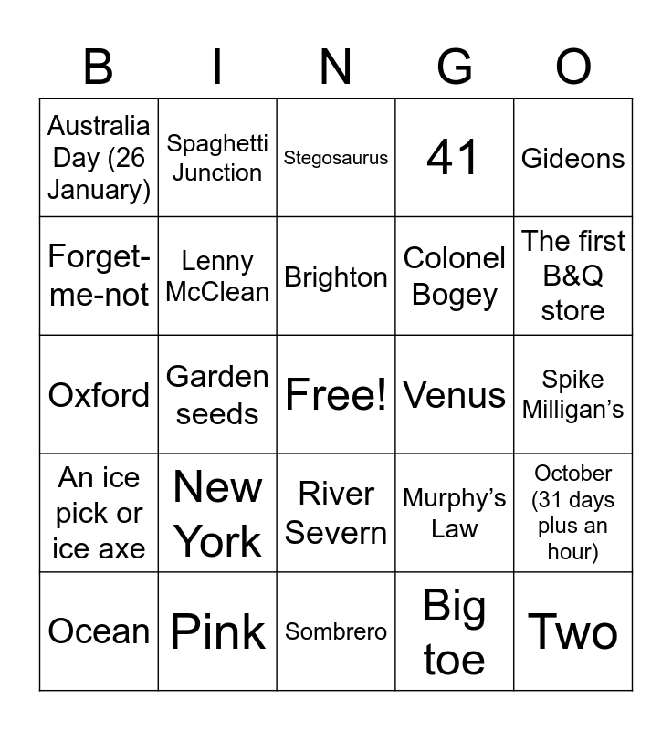 This bingo card has a free space and 30 words: Pink, Alfred, Garden seeds, Lorry Driver, Australia Day (26 January), Stegosaurus, Lenny McClean, River Severn, Venus, Sombrero, Spike Milligan’s, Two, Big toe, Green, The first B&Q store, 1983, Murphy’s Law, An ice pick or ice axe, New York, Gideons, Oxford, The compass, Spaghetti Junction, Colonel Bogey, Forget-me-not, 41, October (31 days plus an hour), Ocean, Brighton and Jim Dale.