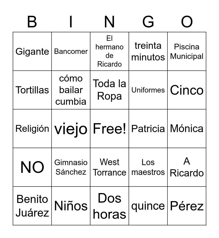 This bingo card has a free space and 24 words: Gimnasio Sánchez, Niños, Toda la Ropa, Benito Juárez, Piscina Municipal, Gigante, Tortillas, Bancomer, Patricia, West Torrance, Uniformes, Religión, Los maestros, A Ricardo, cómo bailar cumbia, quince, Mónica, El hermano de Ricardo, Cinco, viejo, Pérez, NO, treinta minutos and Dos horas.