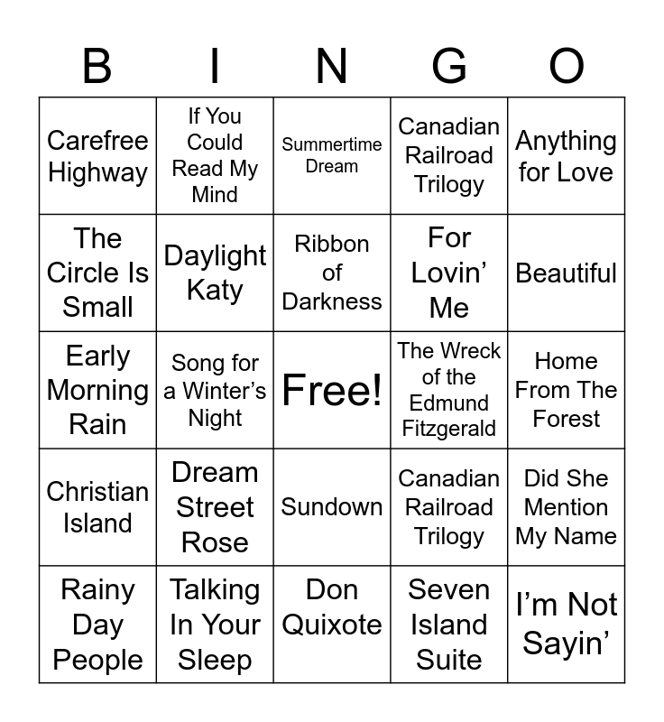 This bingo card has a free space and 24 words: Dream Street Rose, Talking In Your Sleep, Ribbon of Darkness, Rainy Day People, Anything for Love, Carefree Highway, The Circle Is Small, If You Could Read My Mind, The Wreck of the Edmund Fitzgerald, Sundown, For Lovin’ Me, Early Morning Rain, Canadian Railroad Trilogy, Did She Mention My Name, Daylight Katy, Seven Island Suite, Home From The Forest, Summertime Dream, Beautiful, Song for a Winter’s Night, I’m Not Sayin’, Christian Island, Canadian Railroad Trilogy and Don Quixote.