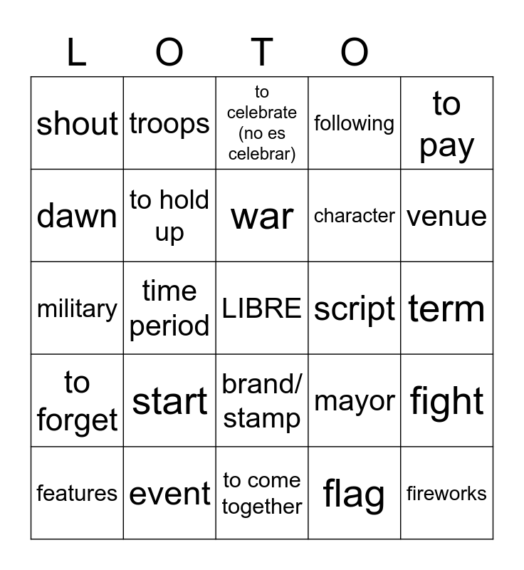 This bingo card has a free space and 24 words: start, event, war, features, to pay, shout, dawn, troops, script, brand/ stamp, character, military, mayor, fight, to hold up, flag, term, to celebrate (no es celebrar), venue, time period, fireworks, to forget, following and to come together.