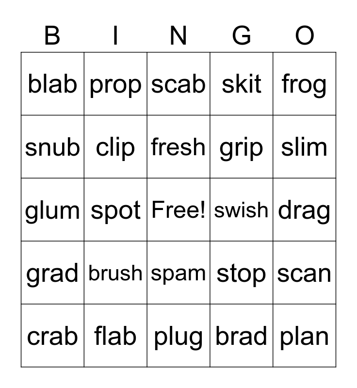 This bingo card has a free space and 29 words: crab, flat, spot, swam, blab, scab, clip, brush, swish, flab, drag, plan, plug, brad, slim, trip, spam, grad, frog, glum, stop, smog, grip, snub, skit, prop, scan, fresh and dress.