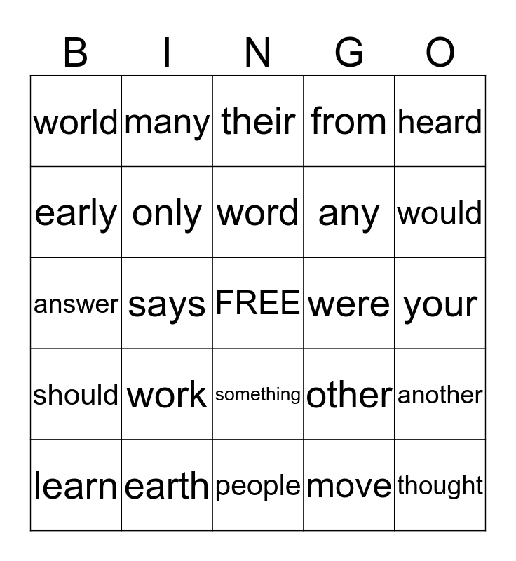 This bingo card has a free space and 24 words: work, earth, word, learn, heard, world, early, many, were, something, any, answer, other, another, only, move, your, their, would, says, thought, should, from and people.