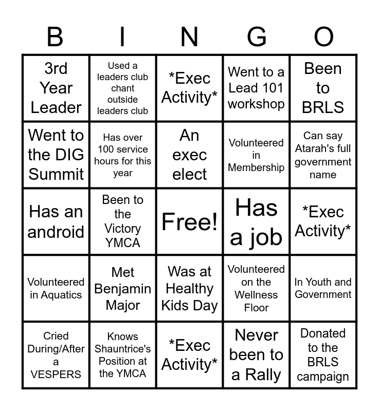 This bingo card has a free space and 24 words: Cried During/After a VESPERS, Met Benjamin Major, An exec elect, Never been to a Rally, Been to BRLS, 3rd Year Leader, Used a leaders club chant outside leaders club, *Exec Activity*, Has a job, *Exec Activity*, Has an android, Has over 100 service hours for this year, Volunteered on the Wellness Floor, In Youth and Government, Went to the DIG Summit, Knows Shauntrice's Position at the YMCA, *Exec Activity*, Went to a Lead 101 workshop, Can say Atarah's full government name, Volunteered in Aquatics, Been to the Victory YMCA, Was at Healthy Kids Day, Volunteered in Membership and Donated to the BRLS campaign.