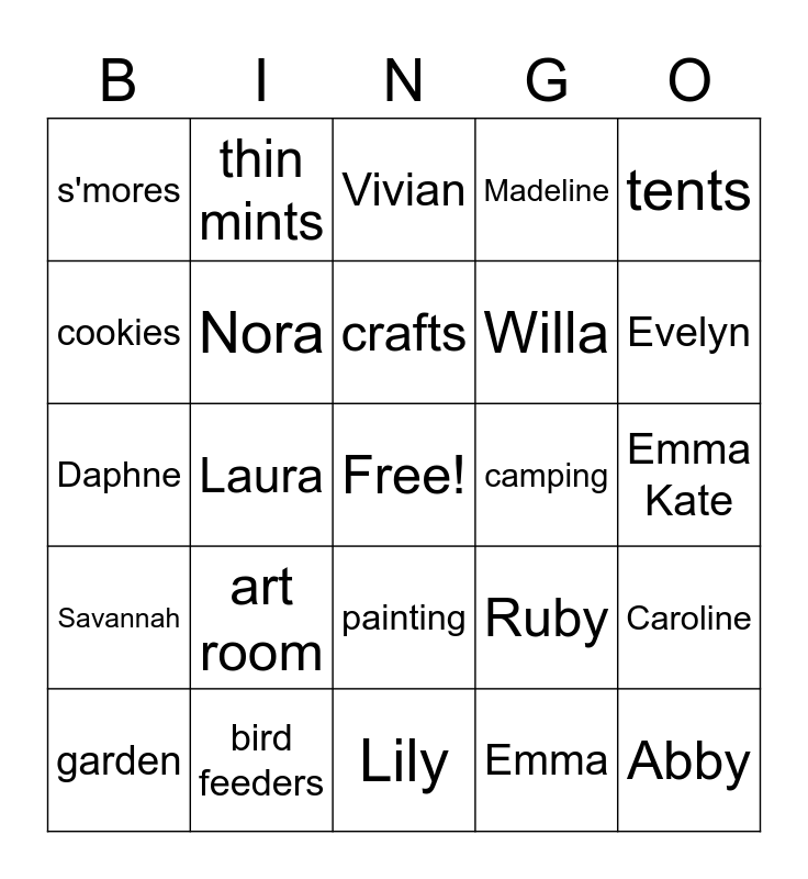 This bingo card has a free space and 24 words: art room, bird feeders, crafts, garden, tents, s'mores, cookies, thin mints, camping, painting, Willa, Daphne, Ruby, Caroline, Nora, Emma, Emma Kate, Vivian, Evelyn, Laura, Abby, Savannah, Madeline and Lily.