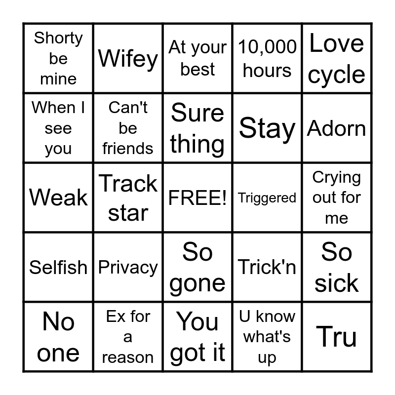 This bingo card has a free space and 39 words: walked outta heaven, Best part, Fountains, Trick'n, So sick, Selfish, Track star, we belong together, Triggered, Crying out for me, When I see you, Wifey, Ignition, Adorn, Weak, Privacy, So gone, 10,000 hours, Remember the time, No one, Can't be friends, Sure thing, U know what's up, Love cycle, Inside, Ex for a reason, You got it, Sexy love, My boo, Shorty be mine, Shawty, Love is Blind, Stay, Tru, Differences, Cater 2 U, At your best, I'm sprung and Girl of my dreams.