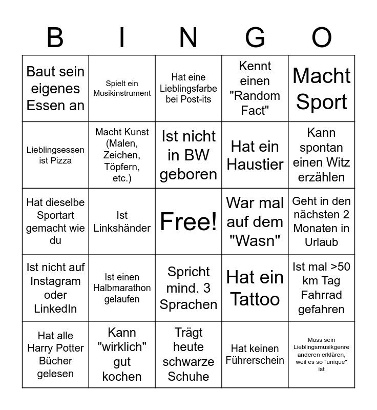 This bingo card has a free space and 24 words: Ist einen Halbmarathon gelaufen, Kann "wirklich" gut kochen, Ist nicht in BW geboren, Hat alle Harry Potter Bücher gelesen, Macht Sport, Baut sein eigenes Essen an, Lieblingsessen ist Pizza, Spielt ein Musikinstrument, War mal auf dem "Wasn", Spricht mind. 3 Sprachen, Hat ein Haustier, Hat dieselbe Sportart gemacht wie du, Hat ein Tattoo, Ist mal >50 km Tag Fahrrad gefahren, Macht Kunst (Malen, Zeichen, Töpfern, etc.), Hat keinen Führerschein, Geht in den nächsten 2 Monaten in Urlaub, Hat eine Lieblingsfarbe bei Post-its, Kann spontan einen Witz erzählen, Ist Linkshänder, Muss sein Lieblingsmusikgenre anderen erklären, weil es so "unique" ist, Ist nicht auf Instagram oder LinkedIn, Kennt einen "Random Fact" and Trägt heute schwarze Schuhe.