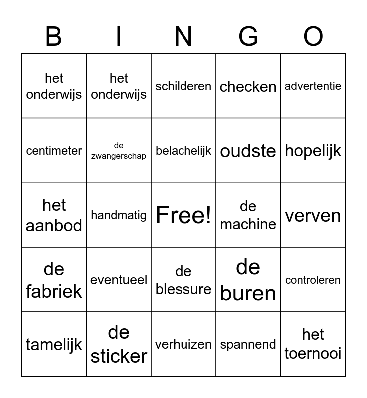This bingo card has a free space and 27 words: de buren, ontmoeten,, oudste, verhuizen, centimeter, schilderen, het onderwijs, de fabriek, de machine, controleren, het aanbod, checken, tamelijk, de sticker, hopelijk, anoniem, de zwangerschap, belachelijk, eventueel, het onderwijs, verven, spannend, handmatig, het toernooi, de blessure, advertentie and de spiegel.