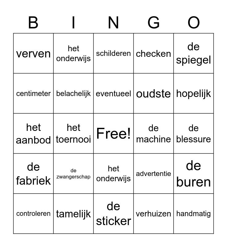 This bingo card has a free space and 28 words: de buren, ontmoeten,, oudste, verhuizen, centimeter, schilderen, het onderwijs, de fabriek, de machine, controleren, het aanbod, checken, tamelijk, de sticker, hopelijk, anoniem, de zwangerschap, belachelijk, eventueel, het onderwijs, verven, spannend, handmatig, het toernooi, de blessure, advertentie, de spiegel and de wijk.