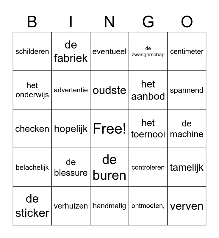 This bingo card has a free space and 26 words: de buren, ontmoeten,, oudste, verhuizen, centimeter, schilderen, het onderwijs, de fabriek, de machine, controleren, het aanbod, checken, tamelijk, de sticker, hopelijk, anoniem, de zwangerschap, belachelijk, eventueel, verven, spannend, handmatig, het toernooi, de blessure, advertentie and de spiegel.