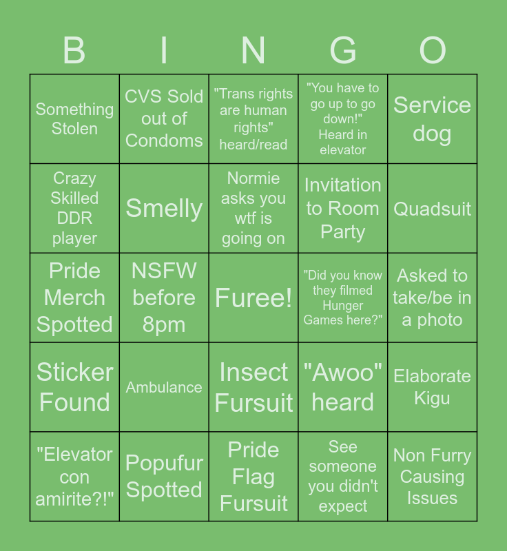 This bingo card has a free space and 24 words: Ambulance, Popufur Spotted, Normie asks you wtf is going on, "Elevator con amirite?!", Service dog, Something Stolen, Crazy Skilled DDR player, CVS Sold out of Condoms, "Did you know they filmed Hunger Games here?", Insect Fursuit, Invitation to Room Party, Pride Merch Spotted, "Awoo" heard, Elaborate Kigu, Smelly, See someone you didn't expect, Asked to take/be in a photo, "Trans rights are human rights" heard/read, Quadsuit, NSFW before 8pm, Non Furry Causing Issues, Sticker Found, "You have to go up to go down!" Heard in elevator and Pride Flag Fursuit.