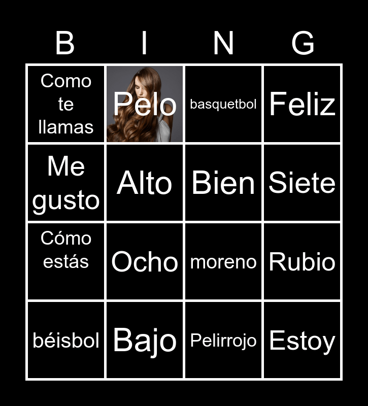 This bingo card has 2 images and 27 words: Hola, Cómo estás, Uno, Alto, basquetbol, Pelo, Estoy, Bajo, Free!, moreno, Feliz, Fútbol americano, Seiz, Ocho, Gracias, Azul, Bien, Siete, Adios, Como te llamas, Señora, béisbol, Rubio, Pelirrojo, Los Deportes, Me gusto and Música.