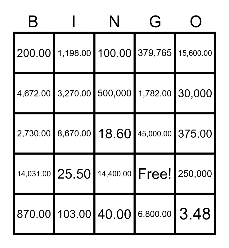 This bingo card has 25 words: 25.50, 40.00, 500,000, 870.00, 15,600.00, 200.00, 4,672.00, 1,198.00, 45,000.00, 14,400.00, 1,782.00, 2,730.00, Free!, 250,000, 3,270.00, 3.48, 375.00, 100.00, 30,000, 8,670.00, 18.60, 103.00, 14,031.00, 379,765 and 6,800.00.
