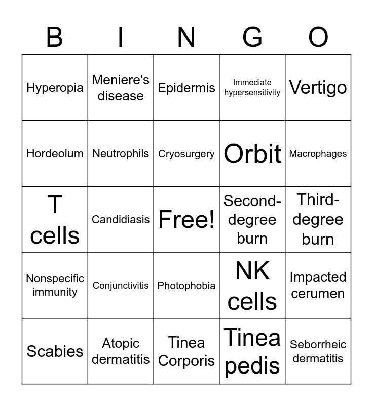This bingo card has a free space and 24 words: Conjunctivitis, Atopic dermatitis, Cryosurgery, Scabies, Vertigo, Hyperopia, Hordeolum, Meniere's disease, Second-degree burn, Photophobia, Orbit, T cells, NK cells, Impacted cerumen, Neutrophils, Tinea pedis, Third-degree burn, Epidermis, Macrophages, Candidiasis, Seborrheic dermatitis, Nonspecific immunity, Immediate hypersensitivity and Tinea Corporis.