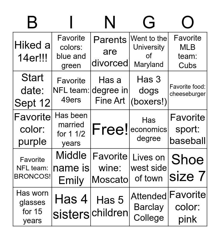 This bingo card has a free space and 24 words: Middle name is Emily, Has 4 sisters, Has a degree in Fine Art, Has worn glasses for 15 years, Favorite MLB team: Cubs, Hiked a 14er!!!, Start date: Sept 12, Favorite colors: blue and green, Has economics degree, Favorite wine: Moscato, Has 3 dogs (boxers!), Favorite color: purple, Lives on west side of town, Shoe size 7, Favorite NFL team: 49ers, Attended Barclay College, Favorite sport: baseball, Parents are divorced, Favorite food: cheeseburger, Has been married for 1 1/2 years, Favorite color: pink, Favorite NFL team: BRONCOS!, Went to the University of Maryland and Has 5 children.