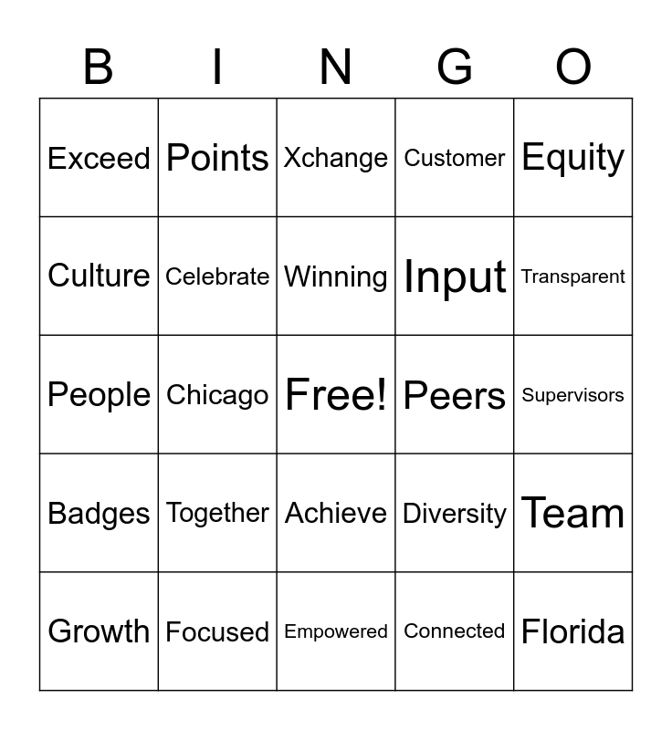This bingo card has a free space and 28 words: Team, Insight, Input, Connected, Culture, Xchange, Points, Badges, Peers, Growth, People, Customer, Focused, Empowered, Transparent, Lead, Together, Celebrate, Winning, Achieve, Exceed, COE, Florida, Chicago, Supervisors, Diversity, Equity and Mindset.