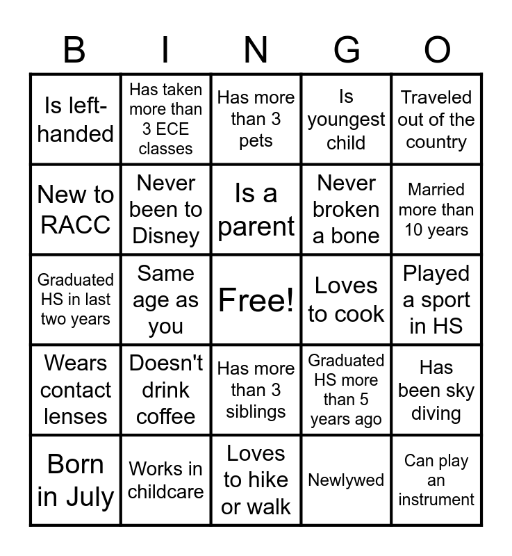 This bingo card has a free space and 24 words: Doesn't drink coffee, Works in childcare, Is a parent, Born in July, Traveled out of the country, Is left-handed, New to RACC, Has taken more than 3 ECE classes, Loves to cook, Has more than 3 siblings, Never broken a bone, Graduated HS in last two years, Graduated HS more than 5 years ago, Has been sky diving, Never been to Disney, Newlywed, Played a sport in HS, Has more than 3 pets, Married more than 10 years, Same age as you, Can play an instrument, Wears contact lenses, Is youngest child and Loves to hike or walk.