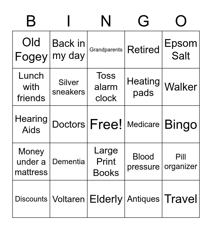 This bingo card has a free space and 45 words: Veteran, Travel, Bifocals, Discounts, 65, Antiques, Grandparents, Over the Hill, Epsom Salt, Voltaren, Retired, Medicare, Large Print Books, Dementia, Memory loss, Elderly, Social Security, Hearing Aids, AARP, Walker, Back in my day, Meals on wheels, Babysitter, Old Fogey, Life Alert, Bingo, Handicap parking, 8 track player, Blood pressure, Money under a mattress, Reading glasses, Pill organizer, Rocking chair, Balding, Arthritis, Doctors, Pension, Golden years, Phone scams, Toss alarm clock, Lunch with friends, Heating pads, Enjoy not working, Silver sneakers and Senior moment.