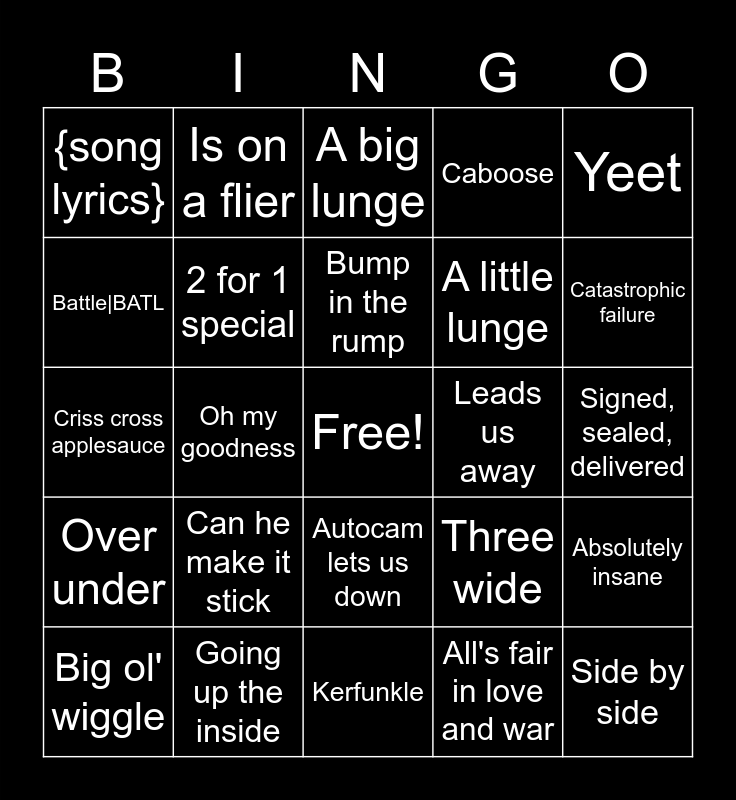This bingo card has a free space and 24 words: Can he make it stick, Going up the inside, Bump in the rump, Big ol' wiggle, Yeet, {song lyrics}, Battle|BATL, Is on a flier, Leads us away, Autocam lets us down, A little lunge, Criss cross applesauce, Three wide, Absolutely insane, 2 for 1 special, All's fair in love and war, Signed, sealed, delivered, A big lunge, Catastrophic failure, Oh my goodness, Side by side, Over under, Caboose and Kerfunkle.