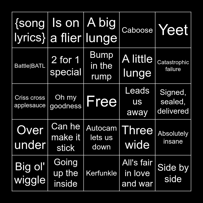 This bingo card has a free space and 24 words: Can he make it stick, Going up the inside, Bump in the rump, Big ol' wiggle, Yeet, {song lyrics}, Battle|BATL, Is on a flier, Leads us away, Autocam lets us down, A little lunge, Criss cross applesauce, Three wide, Absolutely insane, 2 for 1 special, All's fair in love and war, Signed, sealed, delivered, A big lunge, Catastrophic failure, Oh my goodness, Side by side, Over under, Caboose and Kerfunkle.