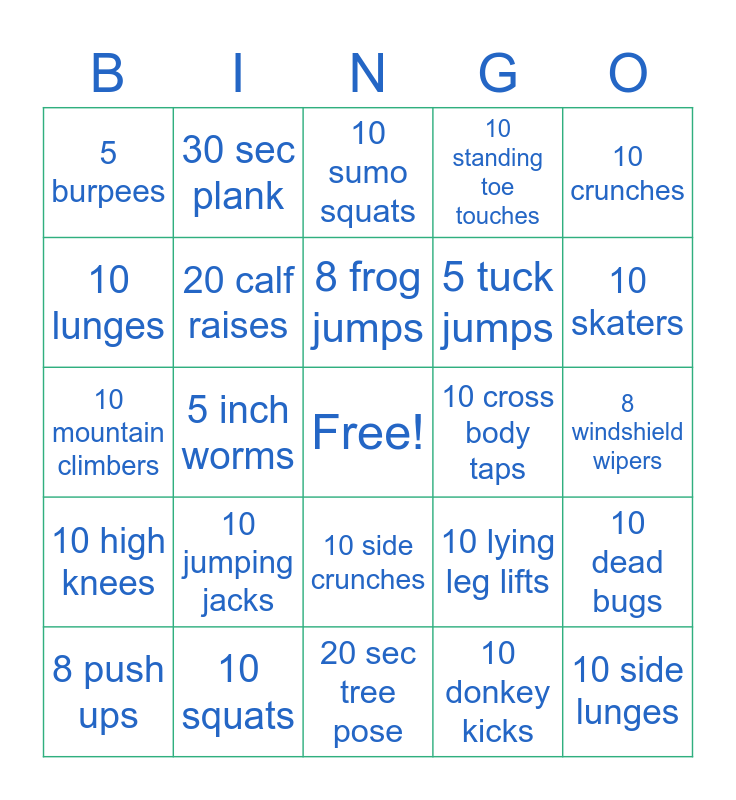 This bingo card has a free space and 24 words: 10 jumping jacks, 10 squats, 8 frog jumps, 8 push ups, 10 crunches, 5 burpees, 10 lunges, 30 sec plank, 10 cross body taps, 10 side crunches, 5 tuck jumps, 10 mountain climbers, 10 lying leg lifts, 10 dead bugs, 20 calf raises, 10 donkey kicks, 8 windshield wipers, 10 sumo squats, 10 skaters, 5 inch worms, 10 side lunges, 10 high knees, 10 standing toe touches and 20 sec tree pose.
