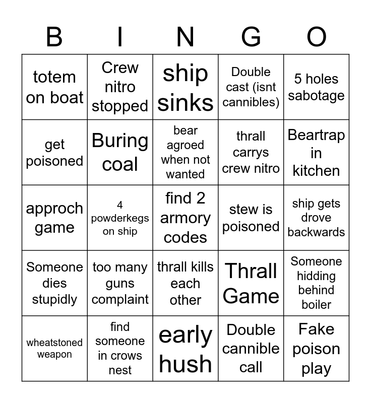 This bingo card has 25 words: too many guns complaint, early hush, bear agroed when not wanted, wheatstoned weapon, 5 holes sabotage, totem on boat, get poisoned, Crew nitro stopped, stew is poisoned, thrall kills each other, thrall carrys crew nitro, approch game, Thrall Game, Someone hidding behind boiler, Buring coal, Fake poison play, ship gets drove backwards, ship sinks, Beartrap in kitchen, 4 powderkegs on ship, find 2 armory codes, find someone in crows nest, Someone dies stupidly, Double cast (isnt cannibles) and Double cannible call.